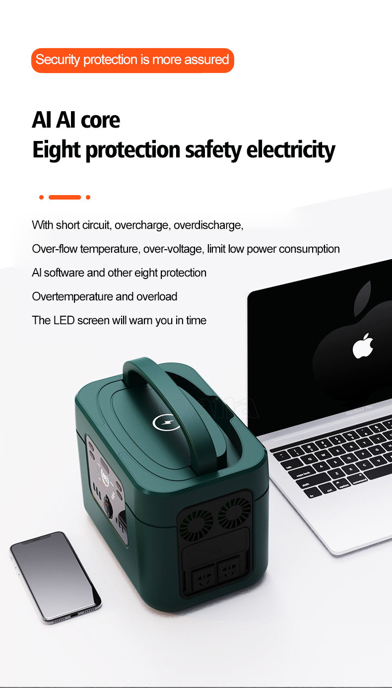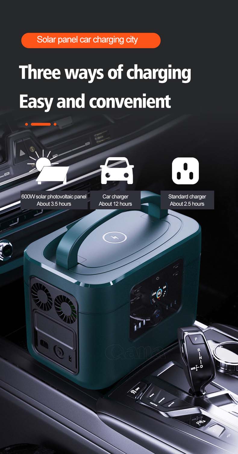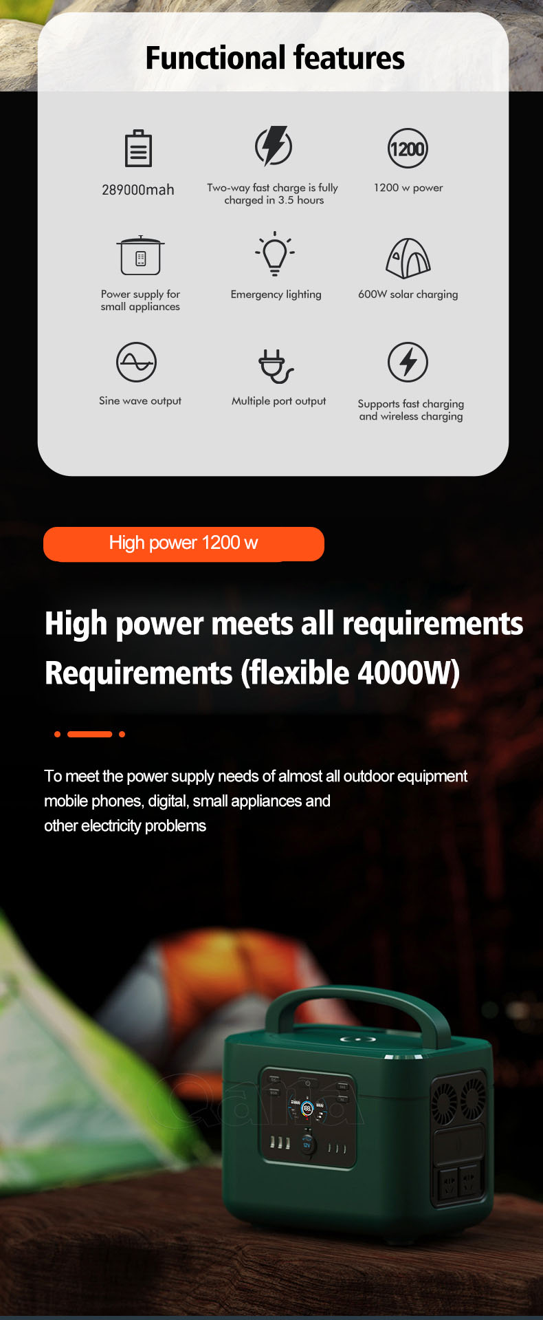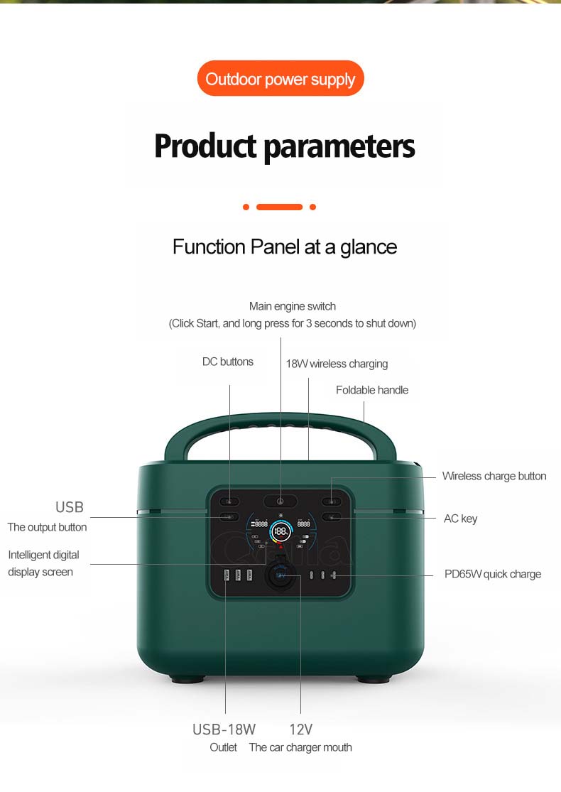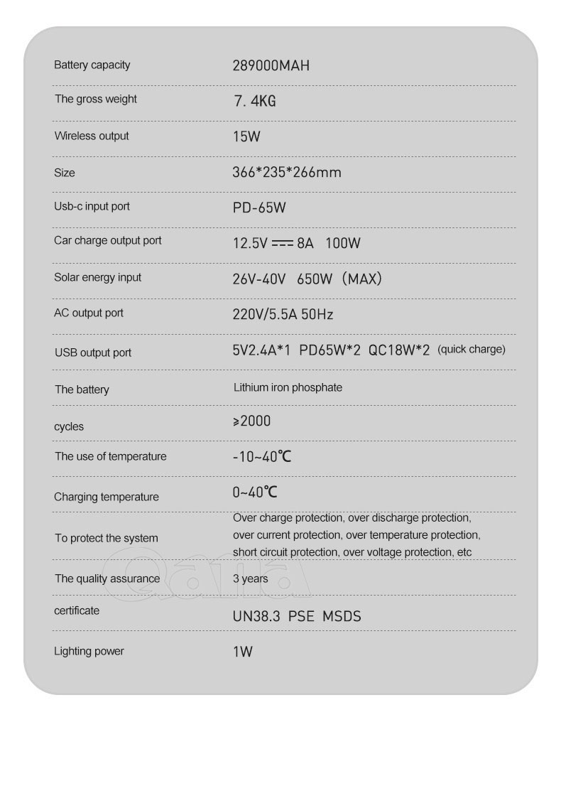 • Product description: Battery capacity: 289000MAH Weight: 7.4KG Wireless output: 15W Size: 366*235*266mm USB-C input port: PD-65W Car charger output port: 12.5V --- 8A100W Solar input: 26V-40V 650W (MAX) AC output p