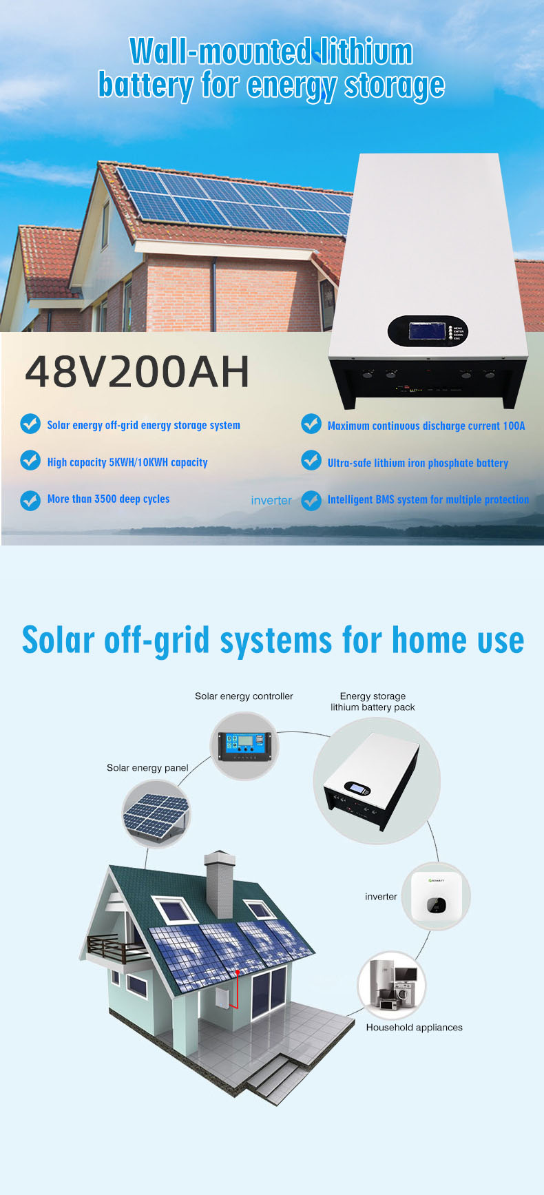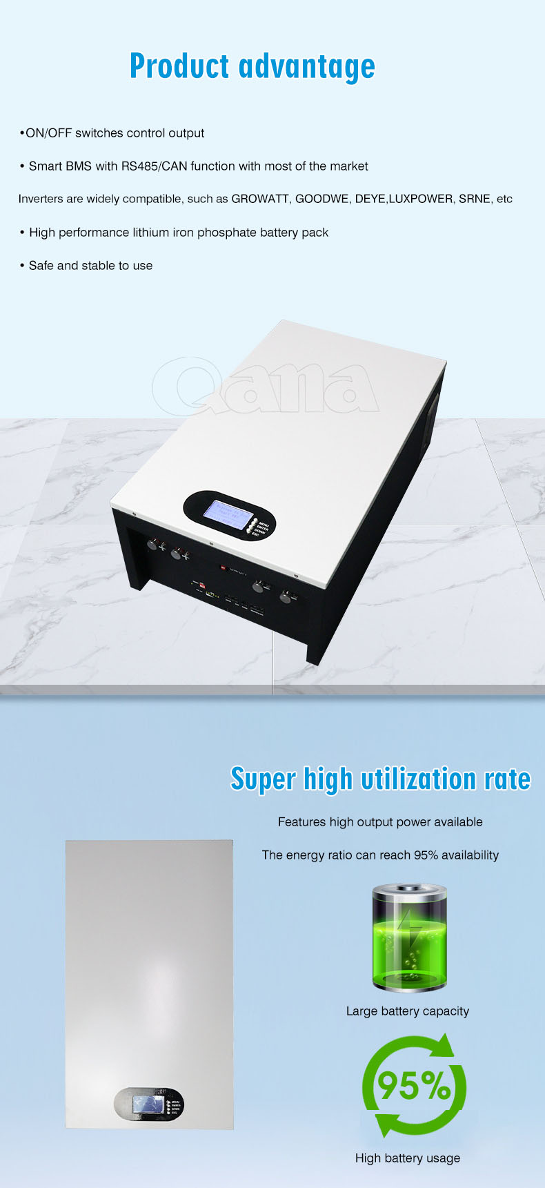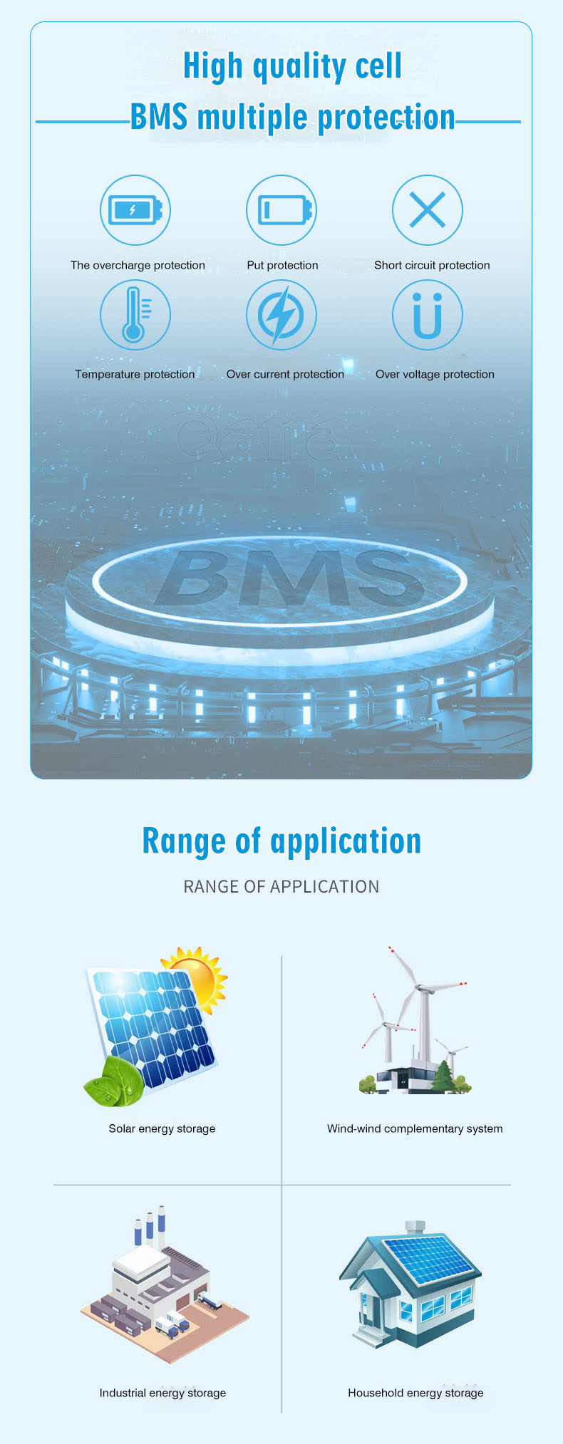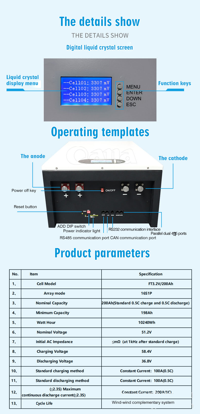 • Product description: Scope of use: power storage Chemical Type: Lithium Iron Phosphate Specifications Model Specifications: 48200 Nominal voltage: 51.2V Nominal capacity: 200AH Cycle times: 3500-4000 times Combinati