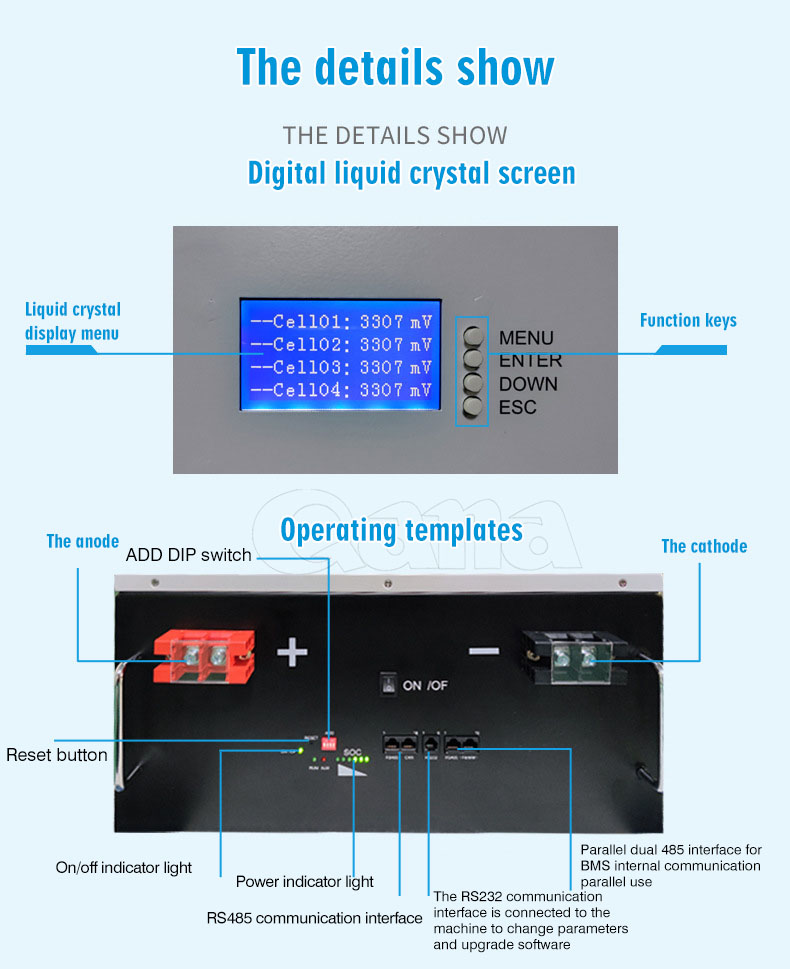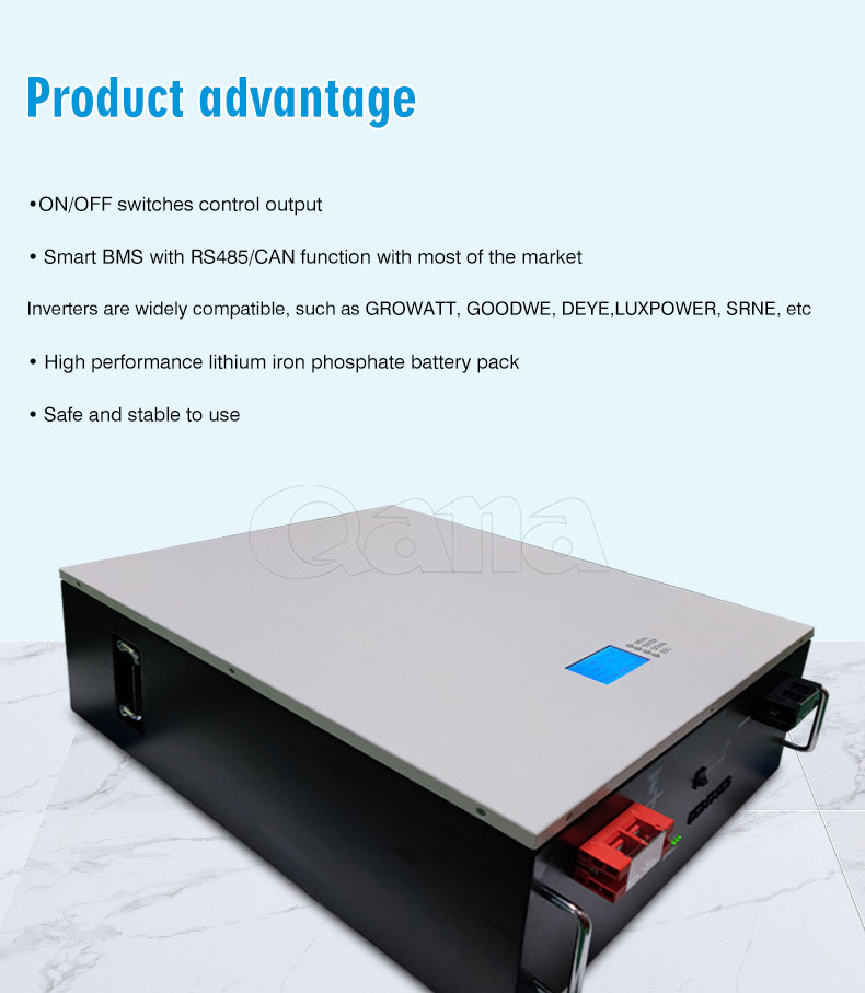 • Product description: Specifications: 48V100AH Nominal voltage: 51.2V Nominal capacity: above 100Ah Cycle times: 3000-3500 times Scope of use: power storage Product certification: ce battery Type: aluminum shell lith