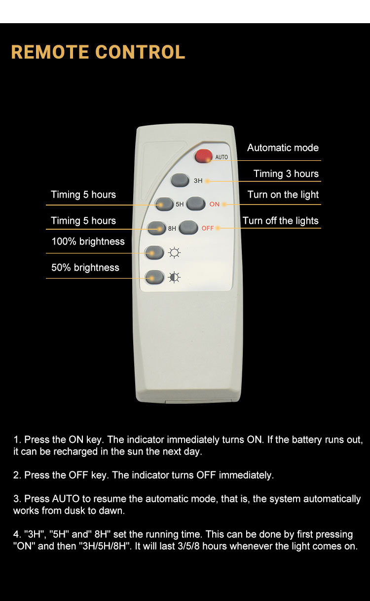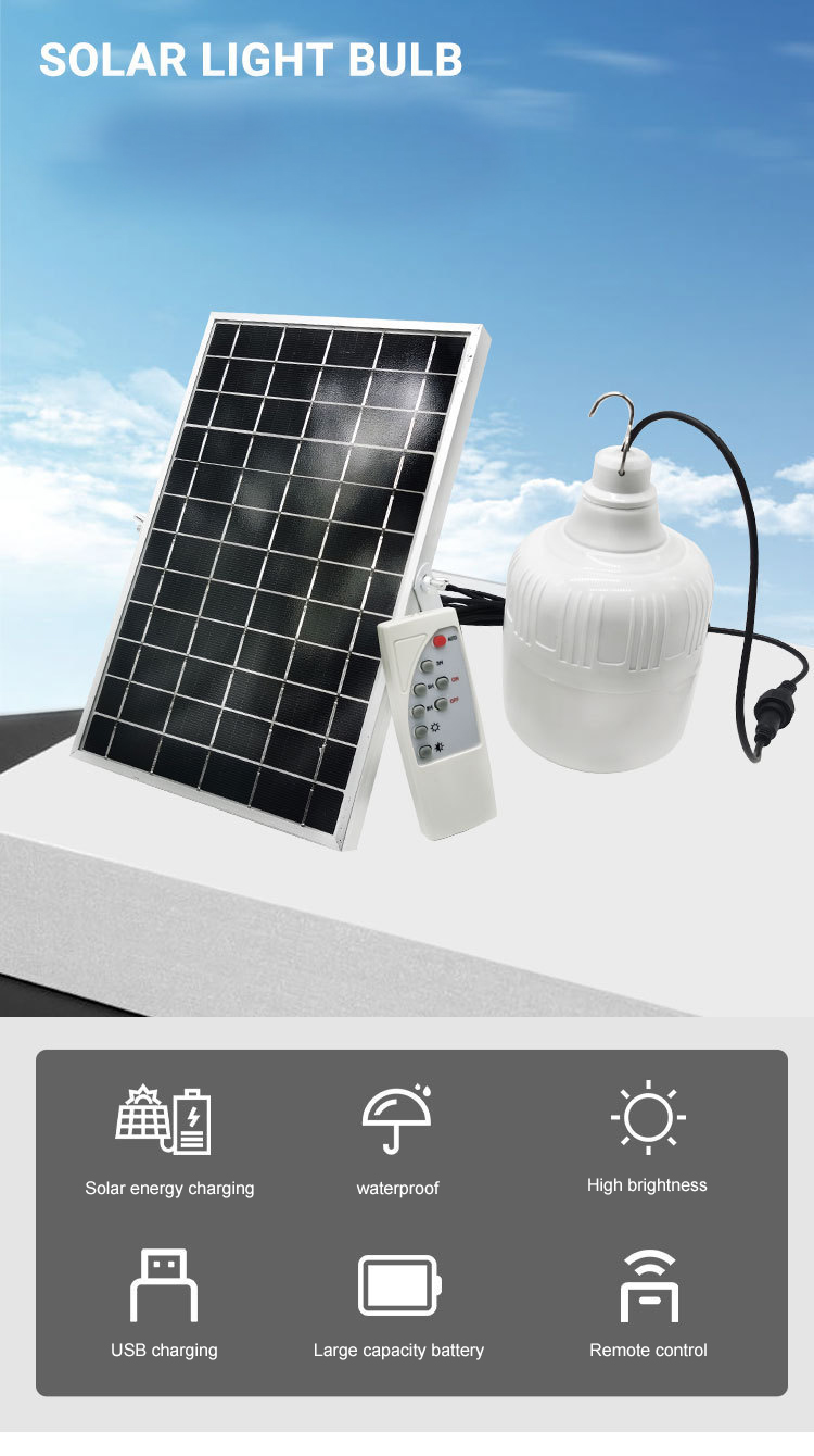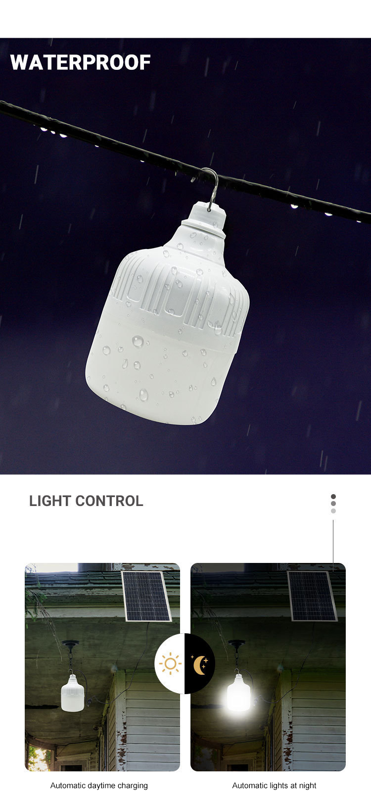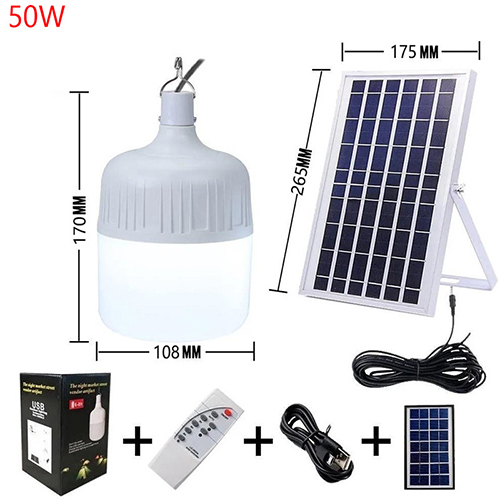 • Product description: Solar panel:Polysilicon(6V 15W) Solar panel size:265*175mm Battery:LiFePO43.2v 5000mAh LED:SMD5730 40PCS Bulb size:108*170mm Lighting area:100m