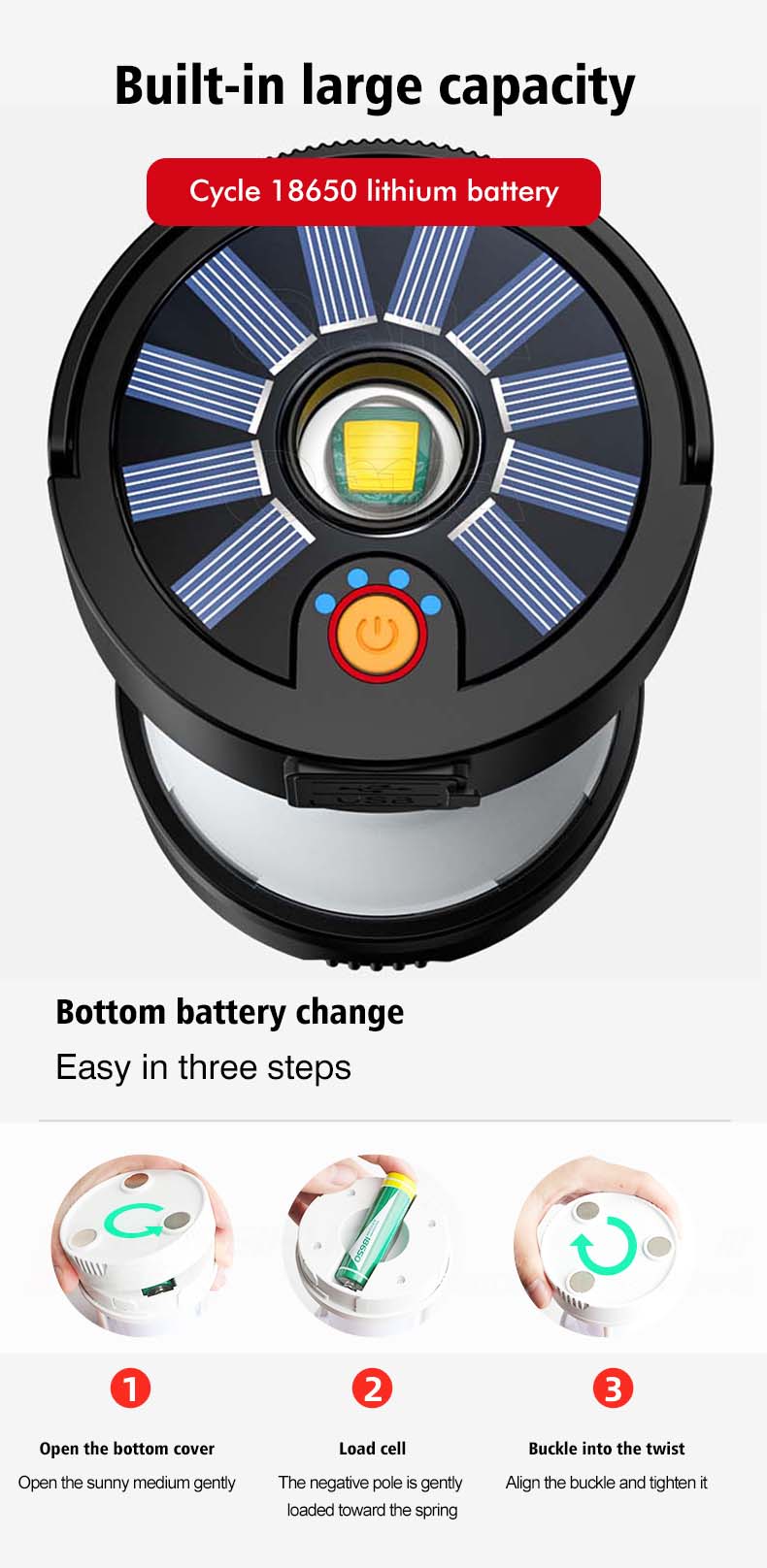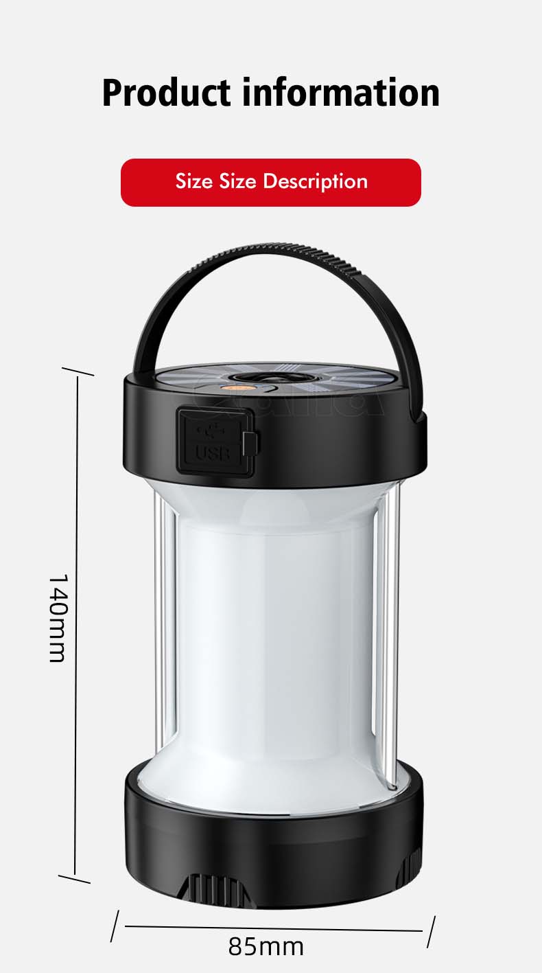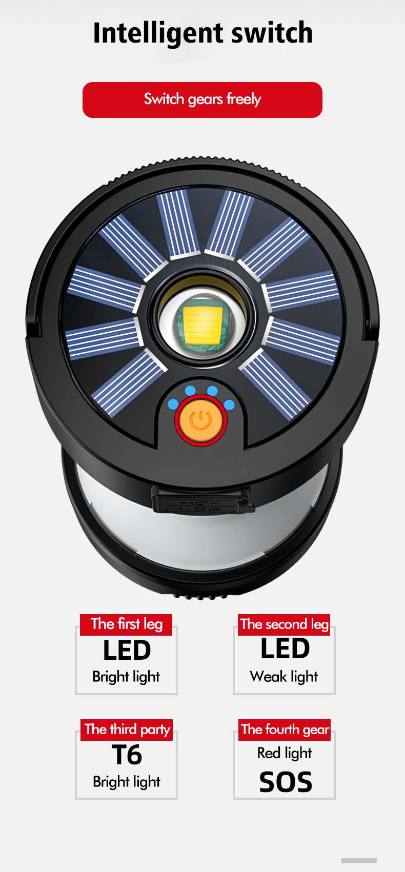 • Product description: name: Multifunctional Solar Camping Light wick: LED+T6 input: TPYE-C input waterproof: life waterproof function: intelligent power display Net weight: 216g Battery: 18650 battery Gross weight: