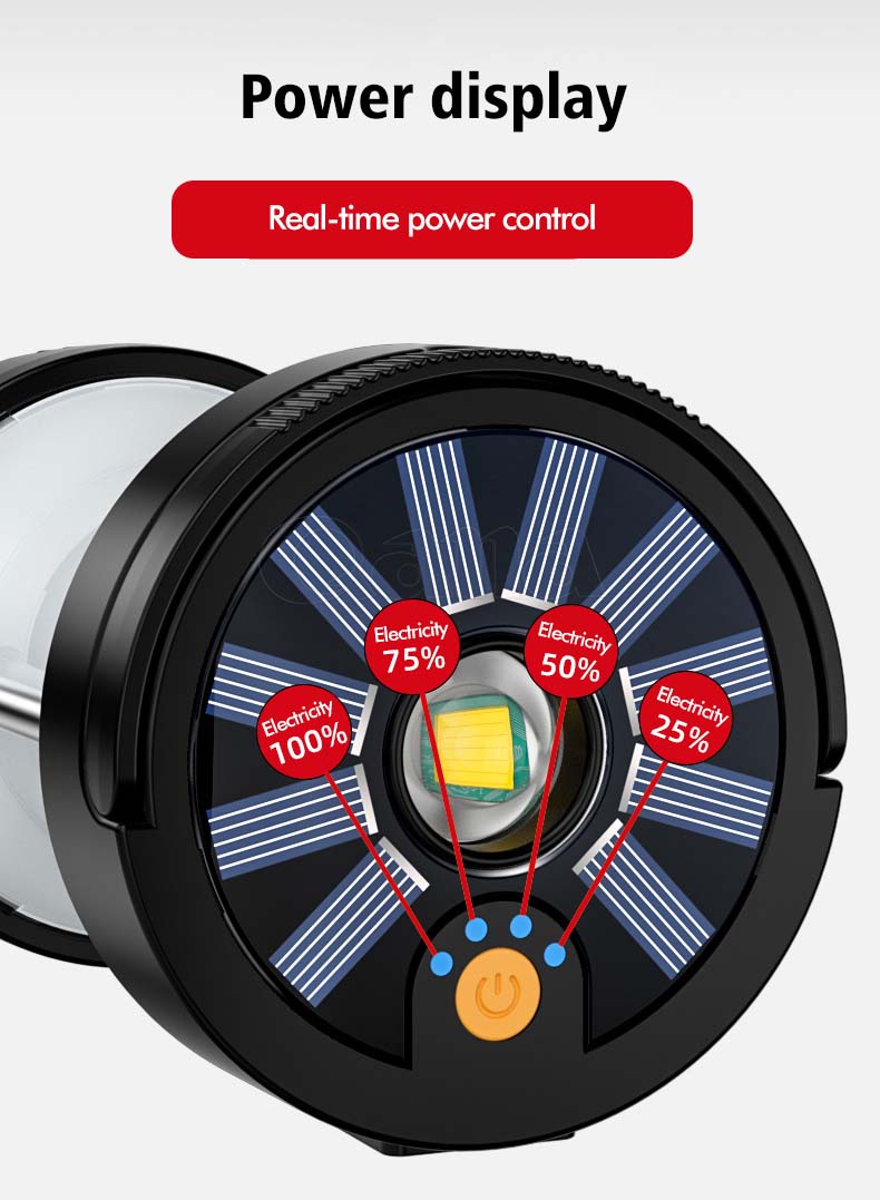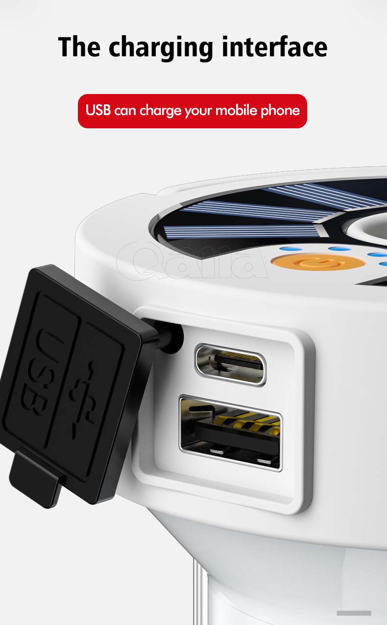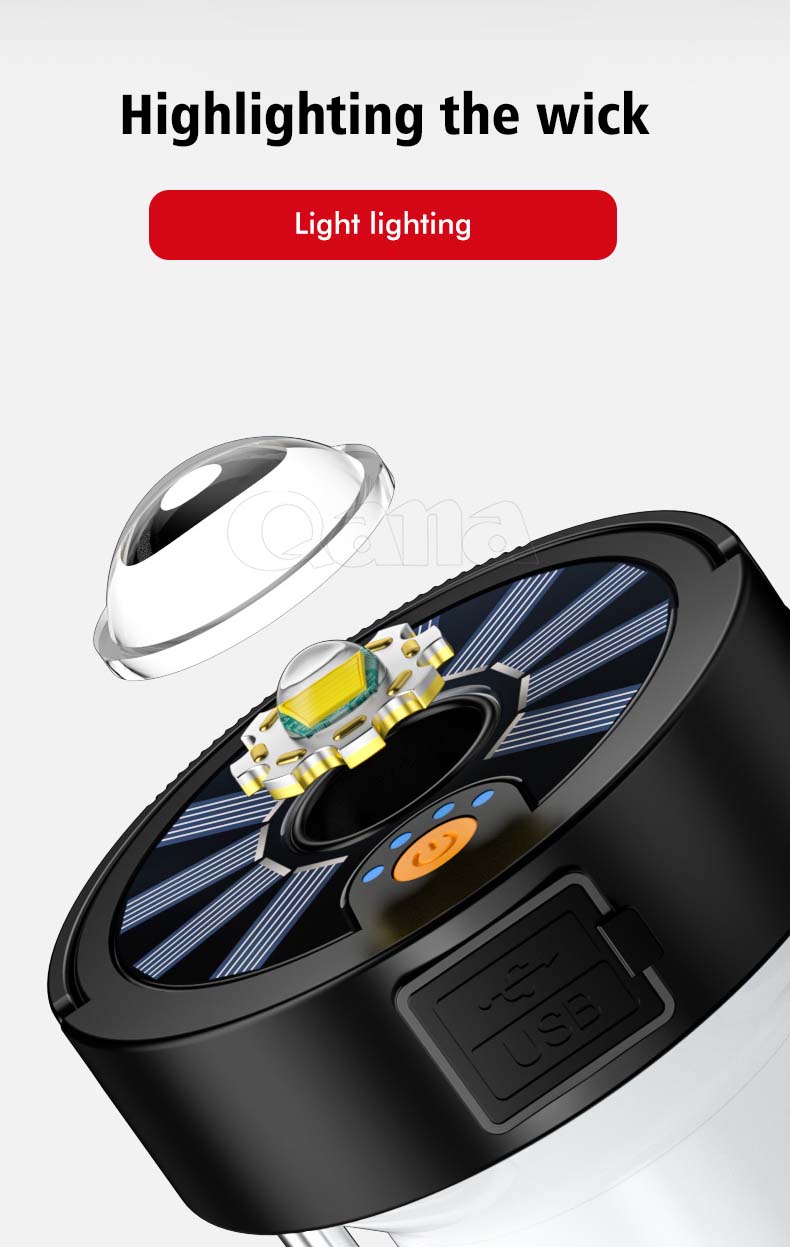 • Product description: name: Multifunctional Solar Camping Light wick: LED+T6 input: TPYE-C input waterproof: life waterproof function: intelligent power display Net weight: 216g Battery: 18650 battery Gross weight: