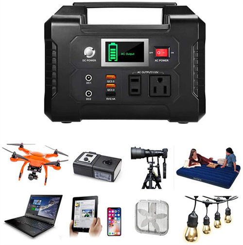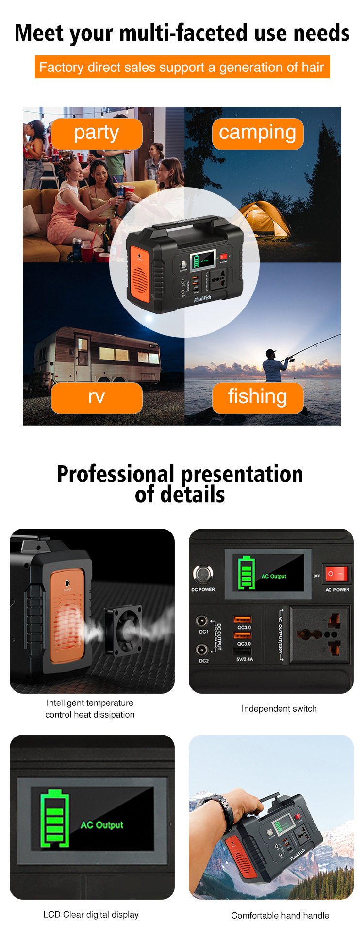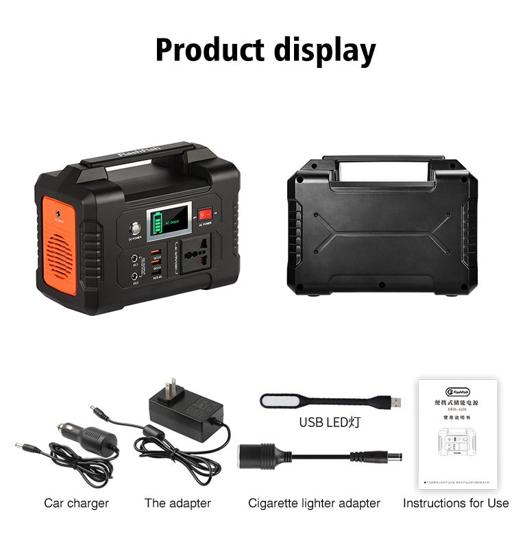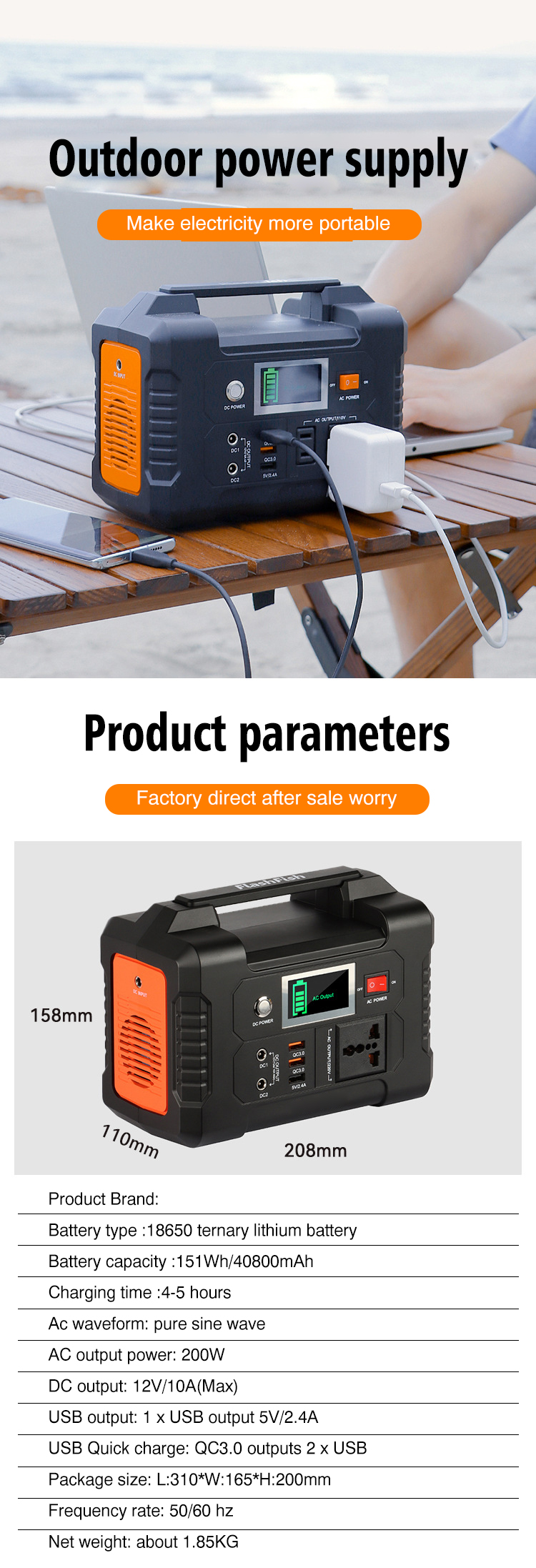 • Product description: Battery type: 18650 ternary lithium battery Battery capacity: 151Wh/40800mAh Charging time: 4-5 hours AC waveform: pure sine wave AC output power: 200w DC output: 12V/10A(max) USB output: 1*USB ou
