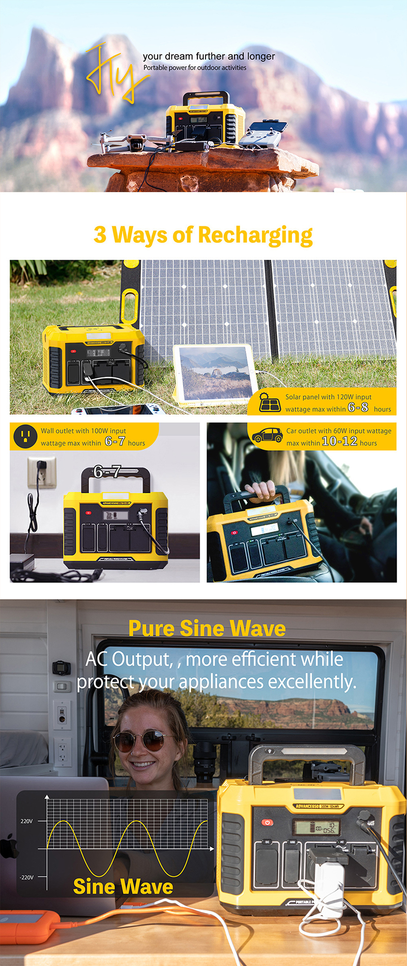 • Product description: Higher Wattage, Larger Capacity With a 634Wh (171351mAh) capacity and 500W outputs, it is ready to power many appliances - mini fridge, cooling fan, air pump, projector, lamp light, and TV. 10W