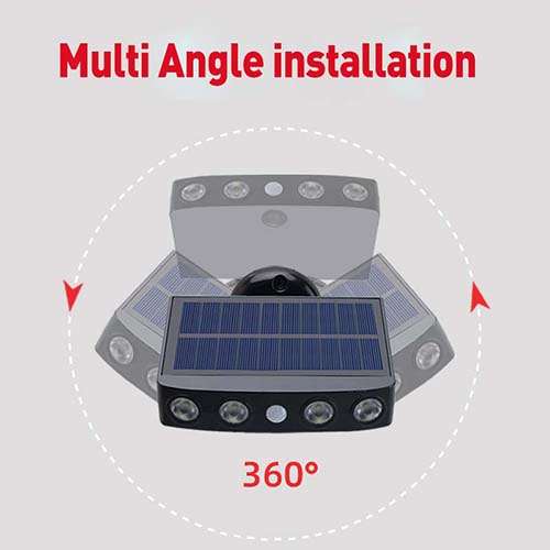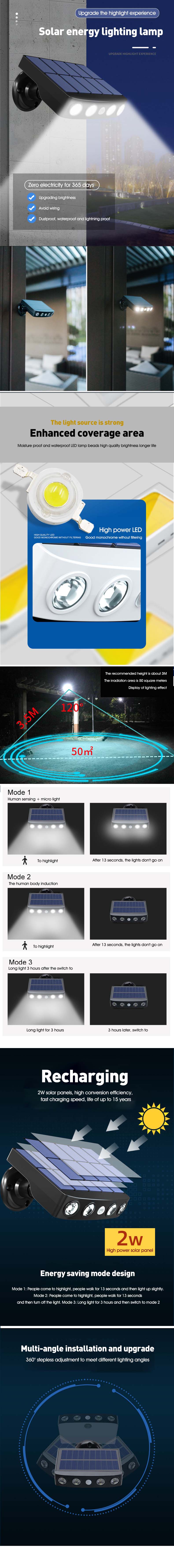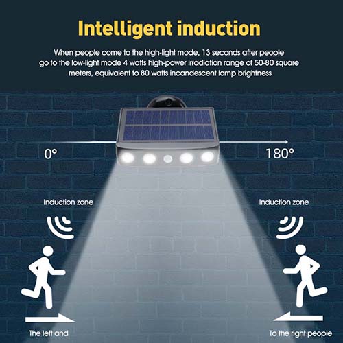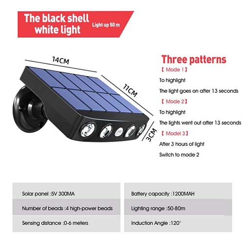 • Product description: Solar panel: 5V 300MA Induction distance: 0-6 meters LED specifications: 4 high-power lamp beads Sensing angle: 120° LED color: white light warm light Charging time: 4-6 hours Battery: Lithium b