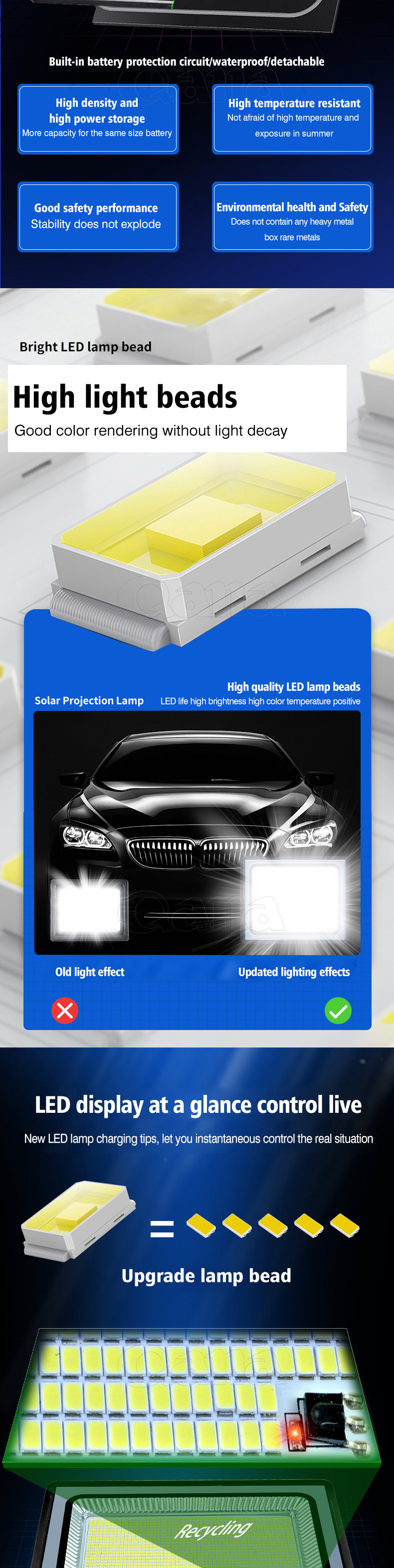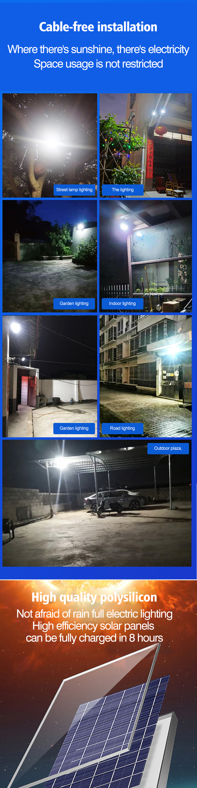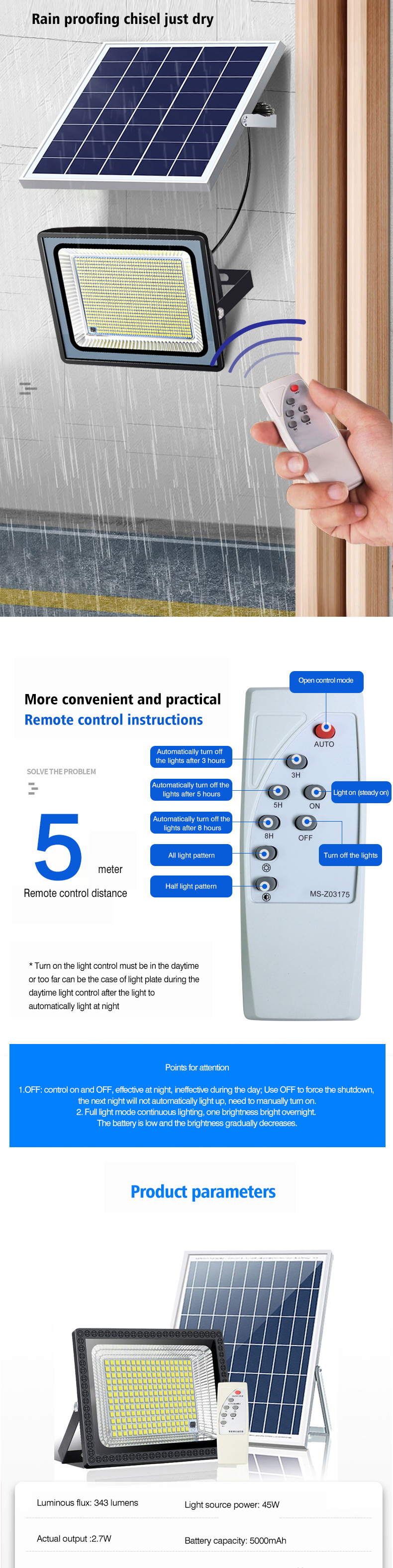 • Product description: Luminous flux: 343 lumens Light source power: 45W Actual output: 2.7W Battery capacity: 5000mAh Battery model: 18650 Number of battery cells: 2 Protective lamps: IP65 Solar panel power: 6w Cha